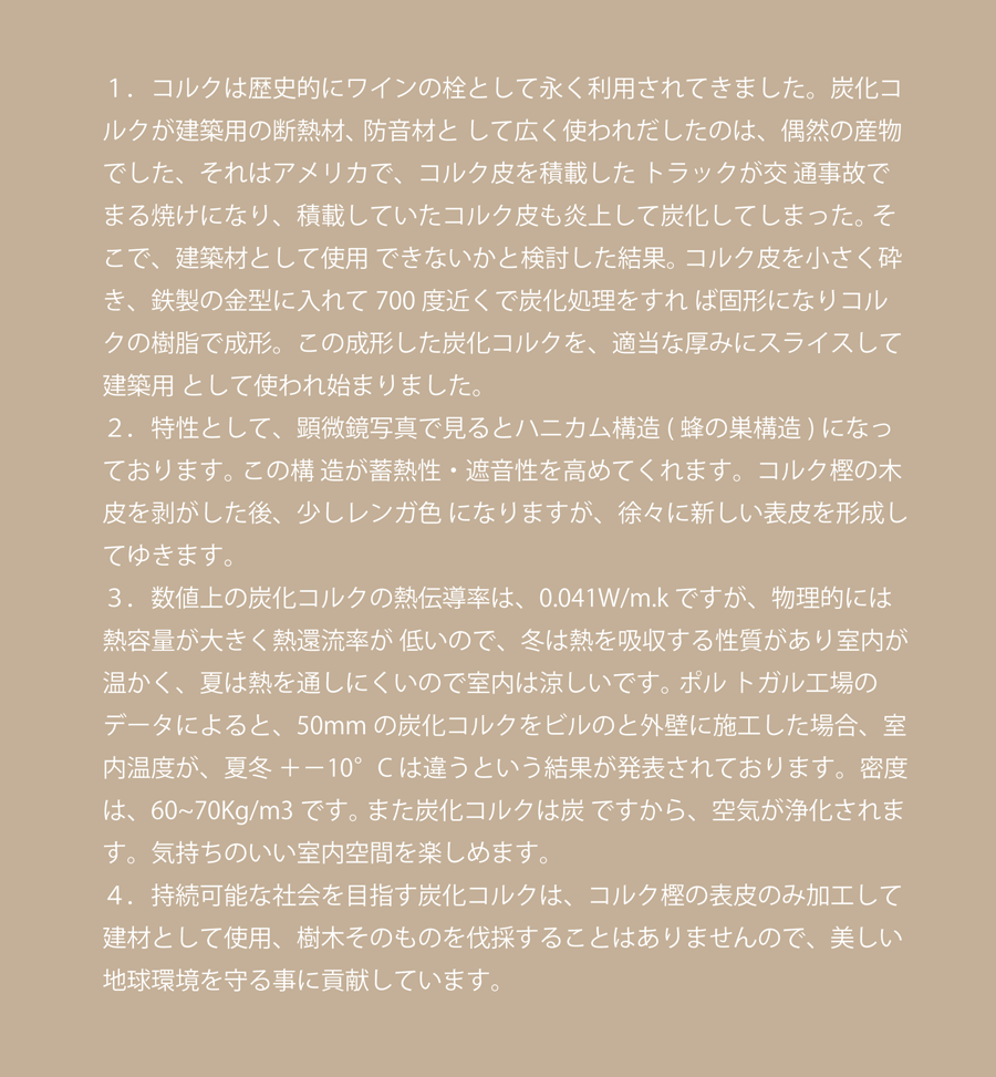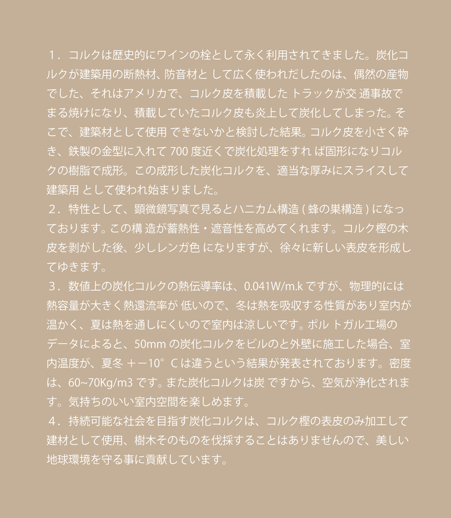炭化コルクの特性とエネルギー効率良い住まい作りのご提案